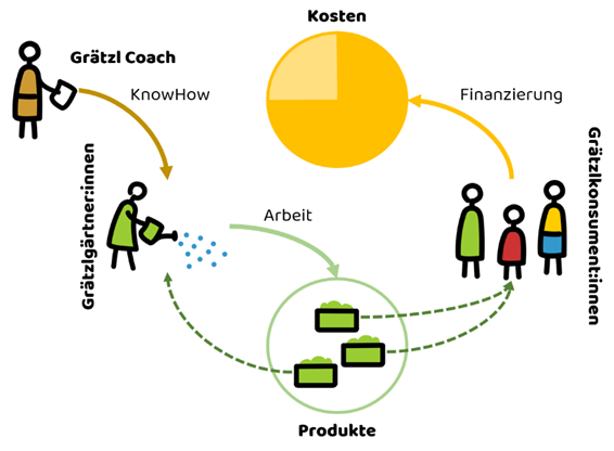 Bei einer Grätzlfarm fallen weder in der Ausbildung, noch später im eigenen Gemeinschaftsgarten Kosten für die Arbeit an. Die Arbeit wird von Mitgliedern geleistet. Die Betriebskosten werden von Fördermitgliedern finanziert.